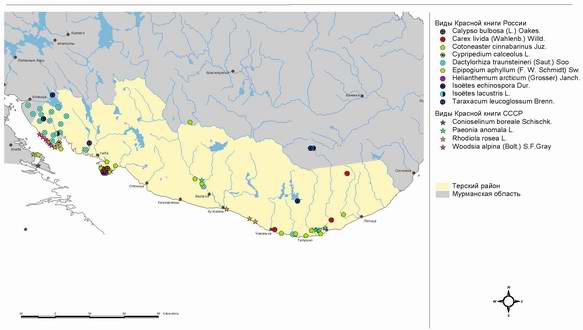 | Начало | "Кутса" | "Терский берег" | "Хибины" | "Лапландский лес" | Карта 6. Виды сосудистых растений, занесенные в Красные книги России и СССР на территории Терского района