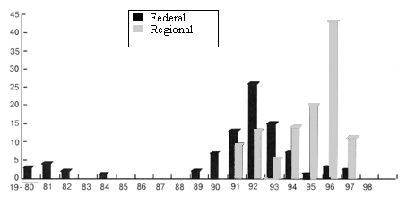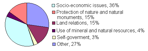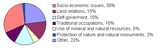 Note, too, the qualitative differences between federally and regionally created laws (Fig. 2 and 3). First, federal legislation directly concerning small indigenous peoples of the North consisted mainly in presidential decrees, parliamentary resolutions and government instructions, whereas regional legislation consisted primarily in laws. Second, while there are roughly as many federal laws on land relations and the use of mineral and natural resources as there are regional ones, the percentage of regional legislation devoted to the local autonomy of small indigenous peoples of the North is greater (15%) than that of federal legislation (3%). In contrast, regional legislation’s percentage of laws on nature conservation is smaller (2%) than that of federal legislation (15%). Meanwhile, regional legislation contains a number of laws concerning traditional occupations whereas federal legislation has almost none.