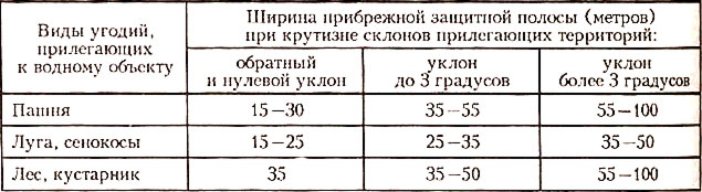 Для истоков рек водоохранная зона устанавливается радиусом не менее 50 метров. Минимальная ширина водоохранных зон для озер и водохранилищ принимается при площади акватории до 2 кв. километров — 300 метров, от 2 кв. километров и более — 500 метров. Для определения ширины водоохранных зон верховых болот, формирующих сток постоянных водотоков, применяются те же принципы, что для озер и водохранилищ. Минимальная ширина водоохранных зон водных объектов, для которых установлены запретные полосы лесов, защищающие нерестилища ценных промысловых видов рыб, принимается равной ширине этих полос. Границы водоохранных зон магистральных и межхозяйственных каналов совмещаются с границами полос отвода земель под эти каналы. Размеры и границы водоохранных зон на территории городов и других поселений устанавливаются исходя из конкретных условий планировки и застройки в соответствии с утвержденными генеральными планами. Для участков рек, заключенных в закрытые коллекторы, водоохранные зоны не устанавливаются. 4. Минимальная ширина прибрежных защитных полос для рек, озер, водохранилищ