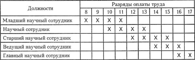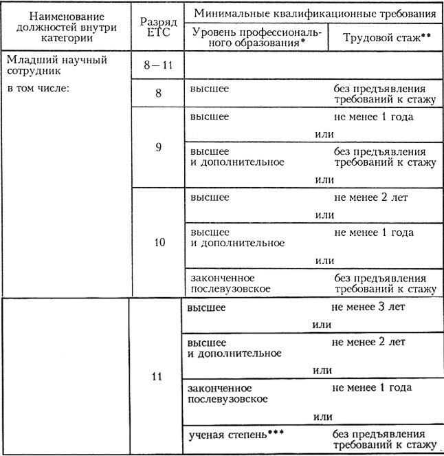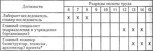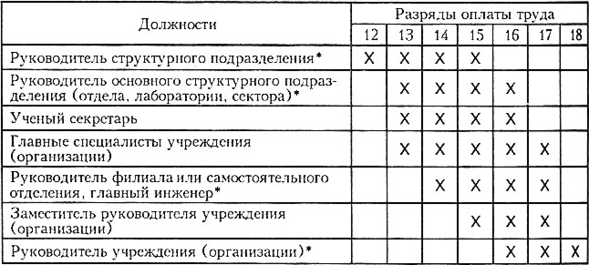 Примечания: * В значимых (по определению аттестационной комиссии) должностях научных работников, профессорско-преподавательского состава высших учебных заведений, специалистов отраслей народного хозяйства, а также на руководящих должностях. ** Для руководителей структурных подразделений, не ведущих научно-исследовательскую работу (планово-финансового отдела, отдела кадров, труда и заработной платы и т. д.), при выполнении должностных обязанностей устанавливается оплата труда в диапазоне 12—15-го разряда при наличии высшего образования и стажа работы по специальности или на руководящих должностях не менее 5 лет.
