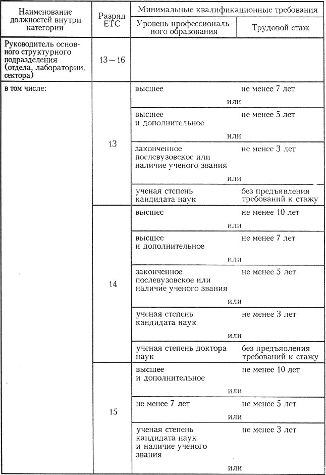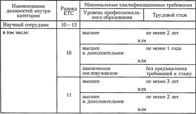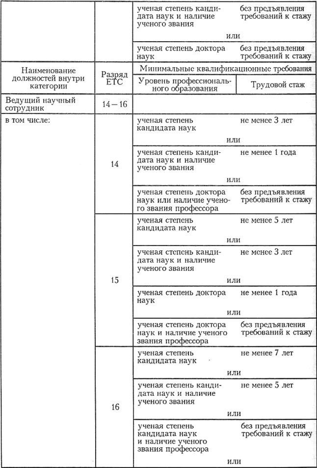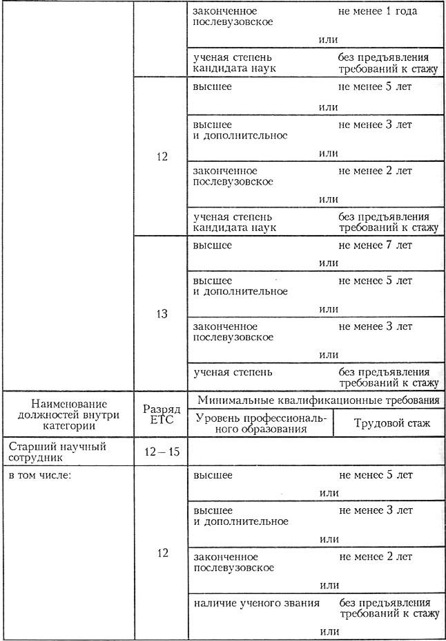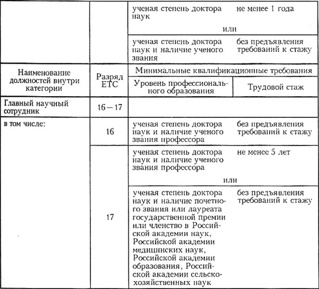 Примечание. Наличие у претендентов на должности научных сотрудников государственных почетных званий (заслуженный деятель науки и техники, заслуженный изобретатель и т. п.) дает право аттестационным комиссиям увеличивать должностной оклад на один разряд, кроме 17-го разряда (главный научный сотрудник). КВАЛИФИКАЦИОННЫЕ ТРЕБОВАНИЯ К ДОЛЖНОСТЯМ КАТЕГОРИИ “НАУЧНЫЕ СОТРУДНИКИ”