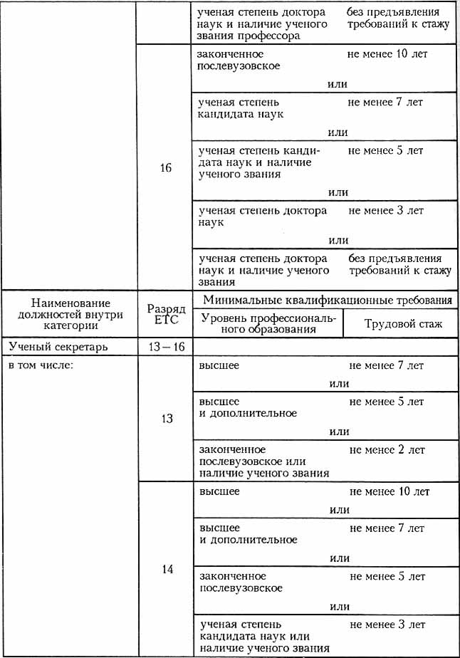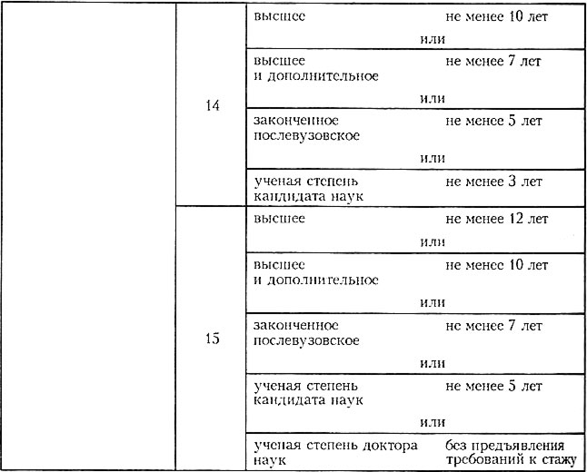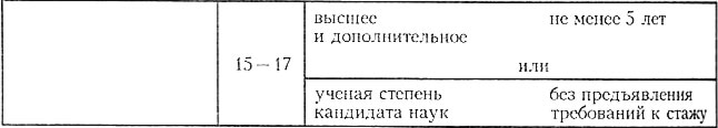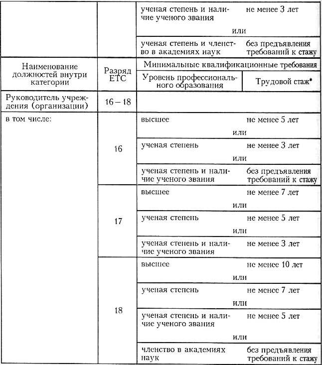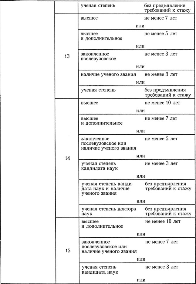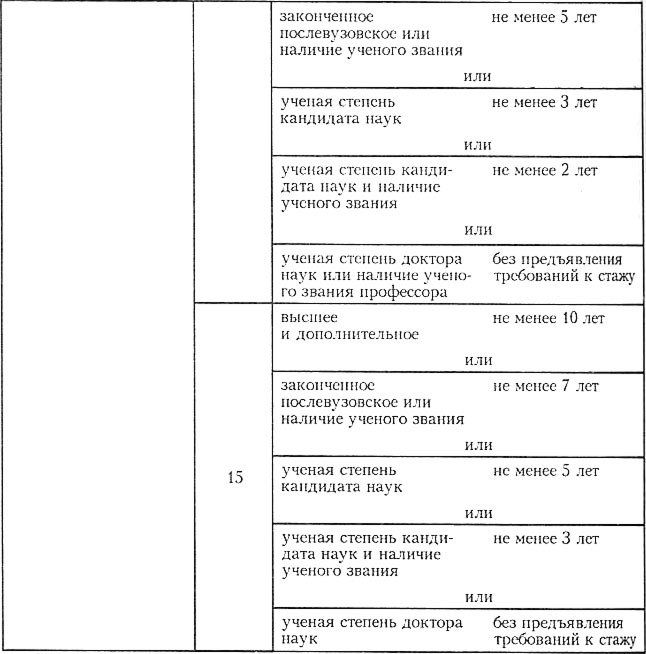 Примечания: * В соответствии с пунктом 5 статьи 27 и статьей 26 Закона Российской Федерации “Об образовании” установлены следующие уровни образования: основное общее, среднее (полное) общее, начальное профессиональное, среднее профессиональное, высшее профессиональное, послевузовское профессиональное (аспирантура, адъюнктура, ординатура), а также дополнительное (в учреждениях повышения квалификации, курсах, центрах профессиональной ориентации, на факультетах совершенствования специалистов и в других образовательных учреждениях, имеющих соответствующую лицензию). ** Учитывается трудовой стаж в должностях научных работников или профессорско-преподавательского состава высших учебных заведений, а также в других должностях, которые аттестационными комиссиями признаются как профильные (значимые) для деятельности работника в данной должности. *** Или приравненный к диплому об ученой степени сертификат (диплом) зарубежного образовательного учреждения, признаваемый в Российской Федерации.