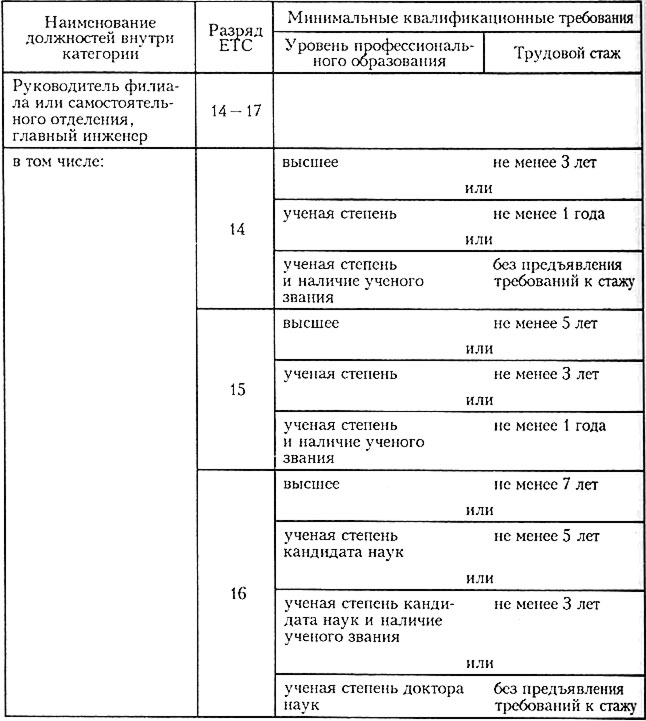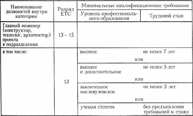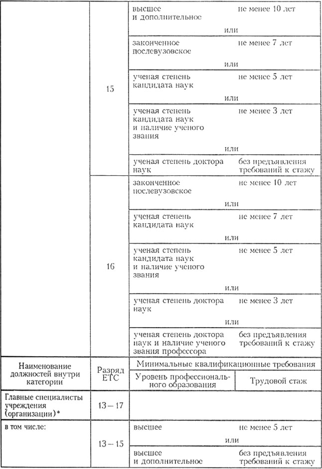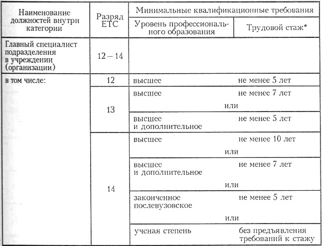 Примечание. * Должностные оклады главного инженера (конструктора, технолога, архитектора) особо крупных и сложных проектов, в выполнении которых участвуют несколько самостоятельных структурных подразделений, устанавливаются в размерах, предусмотренных для главных специалистов организаций (с 13-го по 17-й разряд) согласно приложению № 2 к постановлению Правительства от 14 октября 1992 г. № 785. КВАЛИФИКАЦИОННЫЕ ТРЕБОВАНИЯ К ДОЛЖНОСТЯМ КАТЕГОРИИ