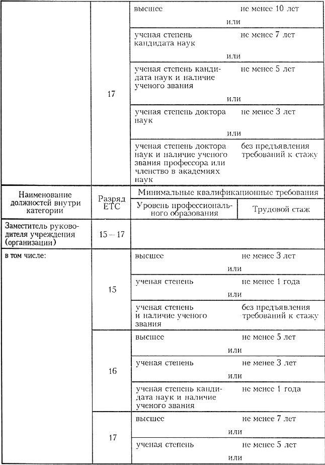 Примечание. * Почетным (научным) руководителям учреждений (организаций), основных или самостоятельных структурных подразделений может быть установлен тот же разряд оплаты труда, что и соответствующему руководителю. Должностные оклады заместителей устанавливаются на 10—20 процентов ниже оклада соответствующего руководителя. КВАЛИФИКАЦИОННЫЕ ТРЕБОВАНИЯ К ДОЛЖНОСТЯМ КАТЕГОРИИ “РУКОВОДИТЕЛИ”