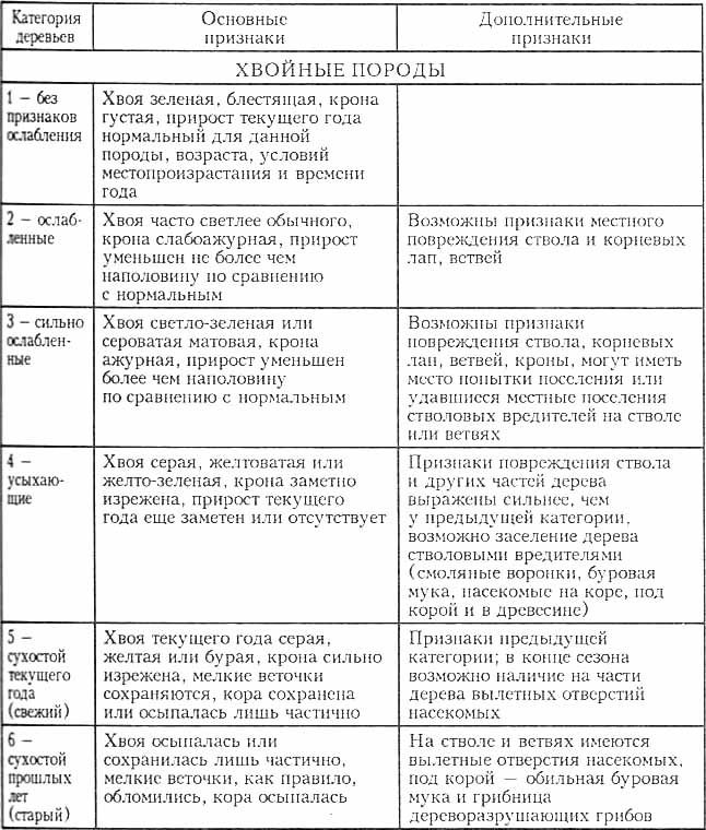 Ветровал, бурелом, снеголом учитывают отдельно — с указанием времени их образования. При перечете обязательно указывают заселенность деревьев разных категорий стволовыми вредителями и пораженность болезнями, если признаки поражения четко выражены. В очагах хвое- и листогрызущих вредителей перечет деревьев производится после периода восстановления хвои и листвы, до этого в случае необходимости учитывается лишь степень объедания хвои (листвы) в процентах (1 — без повреждения, 2 — слабое повреждение: менее 25%, среднее: 25—50%, сильное: 50—75%, полное: более 75%). | другие книги | содержание | вверх | |