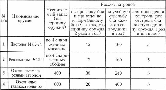 Примечания: 1. Госкомэкологии России или его территориальными органами резервы оружия формируются из расчета 1 единица каждого типа и модели на 10 единиц указанного оружия, а учебного оружия — из расчета 1 единица каждого типа и модели учебного оружия на 25 единиц указанного оружия. 2. Резервы боеприпасов в Госкомэкологии России или его территориальных органах формируются из расчета 10 процентов от неснижаемого запаса на каждую единицу оружия. Учебные патроны выдаются из расчета 5 процентов от неснижаемого запаса на каждую единицу учебного оружия, а холостые патроны — из расчета 10 патронов на пистолет, револьвер и 20 патронов на автомат (каждое учение). | вверх |
