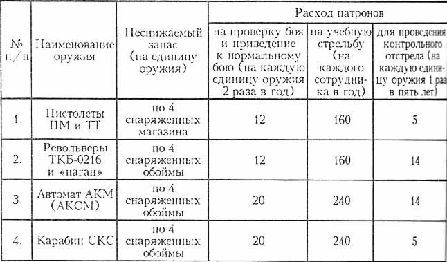 Приложение № 2 ПЕРЕЧЕНЬ I. БОЕВОЕ РУЧНОЕ СТРЕЛКОВОЕ ОГНЕСТРЕЛЬНОЕ ОРУЖИЕ 1. 9 мм пистолет ПМ. 2. 9 мм револьвер ТКБ-0216. 3. 7,62 мм автомат АКМ. 4. 7,62 автомат АКМС. 5. Учебные образцы боевого ручного стрелкового оружия, указанного в пунктах 1—4 настоящего Перечня, и учебные патроны к нему. 6. Патроны к боевому ручному стрелковому оружию, указанному в пунктах 1—4 настоящего Перечня, с обыкновенной пулей и холостые патроны к нему. 7. Патроны с обыкновенной пулей и холостые патроны для: 7,62 мм пистолета ТТ; 7,62 мм револьвера системы “Наган”; 7,62 мм для карабина СКС. II. НОРМЫ ОБЕСПЕЧЕНИЯ БОЕПРИПАСАМИ