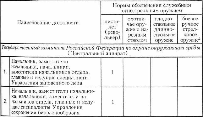 Примечания: 1. Госкомэкологии России или его территориальными органами резервы оружия формируются из расчета 1 единица каждого типа и модели на 10 единиц указанного оружия, а учебного оружия — из расчета 1 единица каждого типа и модели учебного оружия на 25 единиц указанного оружия. 2. Резервы патронов в Госкомэкологии России или его территориальных органах формируются из расчета 10 процентов от неснижаемого запаса на каждую единицу оружия. Учебные патроны выдаются из расчета 5 процентов от неснижаемого запаса на каждую единицу учебного оружия, а холостые патроны — из расчета 10 патронов на пистолет, револьвер (каждое учение). | вверх |