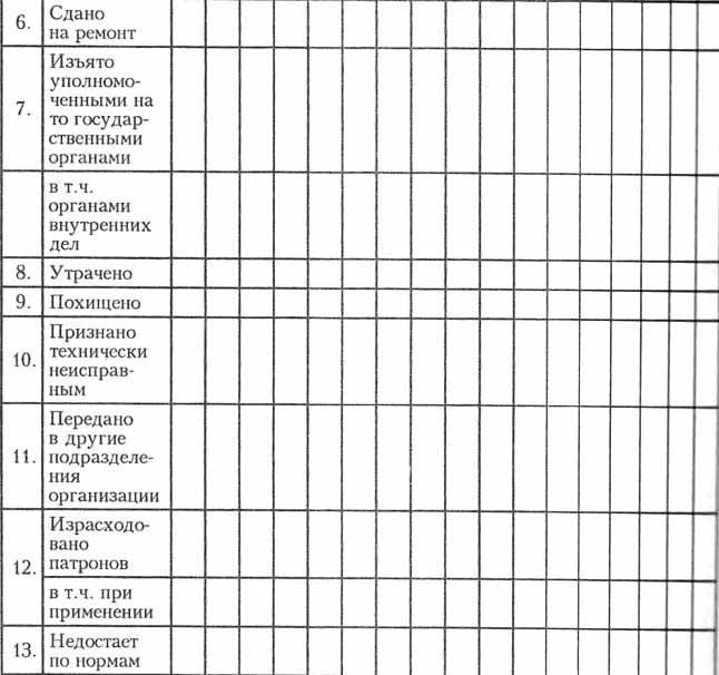 России 6.1. Учет оружия (патронов, боеприпасов) заключается в оформлении установленными оправдательными документами всех операций, связанных с его движением и изменением качественного (технического) состояния, осуществлении правильных и своевременных записей в книгах (карточках) учета, отражении сведений в установленной форме при помощи технических средств учета и обработки (ПЭВМ). Учет должен отражать наличие и обеспеченность Госкомэкологии России и его территориальных органов оружием и позволять осуществлять действенный контроль за его сохранностью. 6.2. Количественный и номерной учет оружия осуществляется должностным лицом, на которого возложена эта работа приказом Госкомэкологии России или его территориального органа. 6.3. Учетными документами являются книги, журналы, наряды, накладные, карточки, ведомости, акты и другие документы, на основании которых осуществляются приходно-расходные операции. 6.4. Учет имеющегося оружия организуется и ведется по формам учетных документов, предусмотренных настоящей Инструкцией для учета оружия в территориальном органе, а в Госкомэкологии России наряду с указанным ведется сводный количественный учет оружия, имеющегося в территориальных органах. 6.5. Записи в книгах и карточках учета производятся чернилами или шариковой ручкой аккуратно, разборчиво, без помарок и подчисток на основании правильно и полностью оформленных подлинных документов. Исправление допущенных ошибок производится путем зачеркивания одной линией неправильной записи и написания правильной так, чтобы зачеркнутое было ясно видно. Новая запись оговаривается надписью “Исправлено” и заверяется подписью лица, ведущего учет. При исправлении записи по истечении большого промежутка времени разрешается исправлять последний итог, о чем должна быть сделана специальная оговорка, указывающая статью и дату проводки, в которой ранее была допущена ошибочная запись. Исправление заверяется подписью лица, ведущего учет. 6.6. При заполнении бланка учетного документа строки, оставшиеся свободными от записей, перечеркиваются зигзагообразной линией. 6.7. Документация подшивается в отдельные дела и хранится в архиве после исполнения не менее пяти лет. 6.8. Все книги по учету оружия должны быть пронумерованы, прошнурованы, скреплены печатью Госкомэкологии России или его территориального органа и подписями соответствующих должностных лиц органов внутренних дел. Учет боевого оружия, полученного в органах внутренних дел во временное пользование, ведется по отдельным книгам и учетным документам. 6.9. Каждый учетный документ должен иметь номер, дату его составления и дату совершения операции, где и кем документ составлен (наименования территориального органа), наименование оружия, его категорию и количество, соответствующие подписи лиц, выдавших и принявших оружие. 6.10. Приходно-расходный документ считается исполненным, когда по нему произведен прием или отпуск оружия, хотя бы в неполном количестве. На недостающее количество получаемого или сдаваемого оружия должны оформляться новые документы. 6.11. Учетные документы, предназначенные для отправки за пределы ведения территориального органа Госкомэкологии России, скрепляются печатью. 6.12. По состоянию на 1 января, по результатам инвентаризации, в книгах учета оружия подводятся и