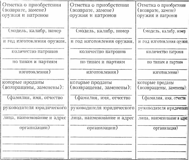 Примечания: 1. Книга предназначена для учета выдачи и приема оружия, средств индивидуальной бронезащиты в пользование и контроля за их возвращением. 2. В книге отдельно ведутся: 2.1. Раздел I — для выдачи и приема оружия, боеприпасов (патронов) для выполнения служебных обязанностей, на занятия и учебные, тренировочные, контрольные и зачетные стрельбы, а также для проверки боя оружия, приведения его к нормальному бою и пристрелки оптических прицелов. 2.2. Раздел II — для приема и выдачи оружия, боеприпасов (патронов) на временное хранение. Для оружия граждан в “Примечании” указываются сведения о соответствующем договоре хранения, а в разделе первоначальные записи для принятого оружия производятся в графах 1—5 и 8—9, а в случае возвращения оружия его владельцу — графы 6—7. 2.3. Раздел III — для приема и возвращения временно изъятого либо сдачи возмездно изъятого и конфискованного у нарушителей оружия, боеприпасов (патронов) и других взрывчатых материалов. Данный раздел ведется только в подразделениях, которым Госкомэкологией России предоставлено право кратковременного хранения указанного оружия до его передачи в органы внутренних дел. При этом для временно изъятого оружия первоначальные записи производятся по аналогии с требованиями п. 2.2. настоящих Примечаний. В графе 10 делаются отметки о представленных протоколах изъятия оружия: номера, даты, кем и в отношении кого составлены. | вверх |