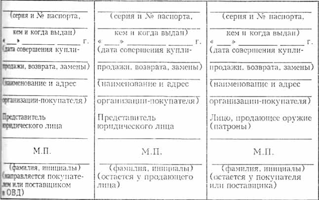 б) списки номерного учета оружия и сведения о патронах, подлежащих продаже, возврату или замене, а также паспорта на оружие; в) протоколы контрольных отстрелов для огнестрельного оружия с нарезным стволом. Заявленные к продаже оружие и патроны подлежат осмотру технической комиссией органов внутренних дел. По результатам осмотра составляется акт технического состояния оружия и патронов с указанием неисправностей, который прилагается к уведомлению. 2.16. При отсутствии причин, препятствующих продаже, возврату или замене оружия и патронов, назначенному представителю Госкомэкологии России или его территориального органа выдается талон соответствующего подтверждения с бланками его дубликатов о получении органом внутренних дел уведомления. 2.17. После продажи, возврата или замены оружия (патронов) руководитель, должностные лица, на которых возлагается обеспечение установленного порядка оборота оружия, Госкомэкологии России или его территориальные органы принимают меры к сдаче (переоформлению) органам внутренних дел ранее выданных ими разрешений на хранение, хранение и использование, хранение и ношение оружия (патронов) с одновременным представлением дубликата талона с отметкой соответствующих лиц, приобретающих или осуществляющих замену оружия, о его продаже или замене. | вверх |