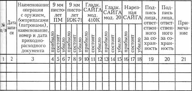 Приложение № 8 — служит для учета патронов, выдаваемых должностным лицам на стрелковом объекте непосредственно перед выполнением упражнений стрельб либо произвольных тренировочных стрельб. Приложение № 9 — ведется материально-ответственным работником на складе либо в комнате для хранения оружия в целях облегчения ведения учета движения патронов, выдаваемых для обеспечения стрельб. Приложение № 10 — служит для учета оружия и (или) боеприпасов (патронов), находящихся в упаковочном ящике при транспортировании и складировании оружия. Приложение № 13 — составляется на оружие и (или) боеприпасы (патроны), принимаемые (передаваемые, сдаваемые, продаваемые) территориальным органом от сторонних юридических лиц или других территориальных органов (сторонним юридическим лицам или другим территориальным органам). Приложение № 14 — предназначено для записи наличия и движения всего оружия (в том числе и боевого оружия), находящегося в Госкомэкологии России или его территориальном органе. Данная книга является основным учетным документом в Госкомэкологии России и его территориальных органах. Раздел 1 книги служит для количественного и номерного учета оружия, боеприпасов, патронов и основных частей огнестрельного оружия. Раздел II — для персонального закрепления оружия за должностными лицами. Приложение № 15 — предназначено для учета оружия и боеприпасов (патронов), выдаваемых должностным лицам в территориальных органах на время исполнения служебных обязанностей, в командировку, для чистки и смазки, передачи оружия в ремонт, на контрольный отстрел и в других случаях, когда органами внутренних дел выдается специальное направление для передачи оружия или подтверждение, полученное после предварительного уведомления о продаже, замене и возврате оружия. Приложение № 16 — ведется каждым территориальным органом. Для каждой категории учетных документов в журнале открывается отдельный раздел (группа листов). Каждый раздел имеет свою порядковую нумерацию от единицы и далее. Оглавление разделов размещается на первой странице книги. Входящие документы записываются в книгу по мере их поступления, а исполненные либо подготовленные (исходящие) — после их подписания соответствующими должностными лицами. На свободном поле лицевой стороны документа (в графе “примечание”) лицо, ведущее учет, делает отметку о проводке документа по учету с указанием места фиксирования завершенной операции (полученной информации): номер книги учета, страницы и пункта (статьи) по каждому наименованию, которые заверяет распиской с датированием выполненной записи. Приложение № 18 — является основным первичным приходно-расходным документом, отражающим прием или выдачу оружия с последующей проводкой операции по книгам и карточкам учета. Приложение № 19 — предназначено для учета ЗИПа, инструмента, материалов и оборудования всех неосновных средств, а именно: снаряжения (кобуры, чехлы, ремни, сумки), ремонтно-эксплуатационного имущества (запасные части, инструменты, принадлежности, смазка, мишени, тара, шкафы и т.д.). Приложение № 20 — оформляется только в Госкомэкологии России или его территориальном органе на боеприпасы (патроны), израсходованные на учебную и тренировочную практику по раздаточно-сдаточным ведомостям, для общего учета списанных патронов за о