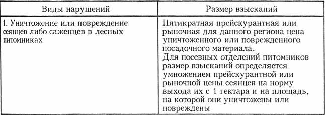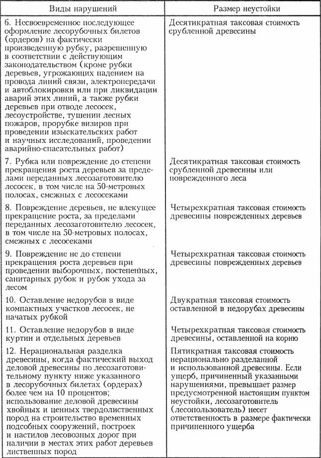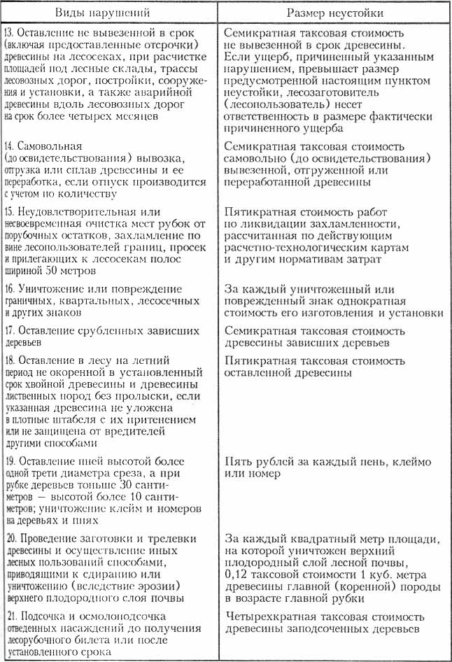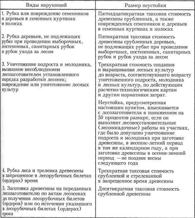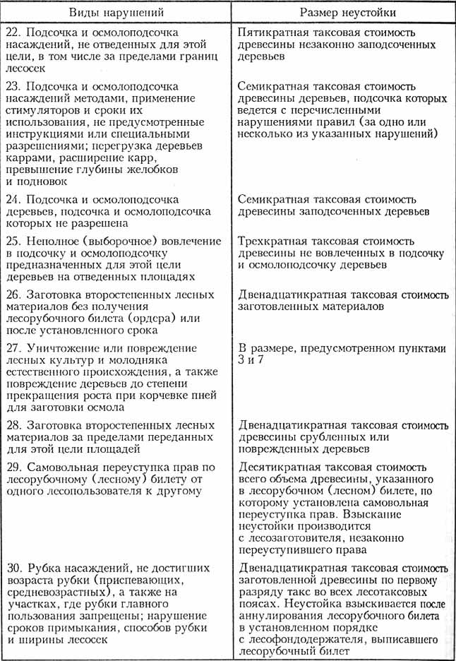 Примечания: 1. Все неустойки исчисляются по таксам на древесину, отпускаемую на корню, без применения норм их снижения. Надбавка к таксам на древесину, отпускаемую на корню, применяется в максимальном размере, независимо от удаленности квартала (урочища), в котором допущено нарушение, до пунктов отгрузки (потребления) древесины во всех лесотаксовых поясах. 2. При исчислении таксовой стоимости древесины разделение ее на деловую и дровяную не производится. Для всего объема древесины применяется такса на деловую древесину средней категории крупности. Объем древесины учитывается (определяется) в коре. В случае определения объема древесины уничтоженных, поврежденных или срубленных деревьев на площади более 1 гектара допускается использование материалов лесоустройства. 3. При исчислении стоимости создания и выращивания лесных культур и других лесовосстановительных работ, уничтожения или повреждения граничных, квартальных, лесосечных и других знаков применяются действующие расчетно-технологические, нормативно-технологические карты и другие нормативы затрат. 4. Незаконная порубка, уничтожение, повреждение деревьев, кустарников и лиан, запрещенных к рубке, влечет увеличение установленных размеров взысканий в два раза. При этом применяются таксы на древесину кедра (дуба) по первому лесотаксовому поясу. 5. Размер взыскания за нарушения, предусмотренные пунктами 2, 4, 5, 6, 7, 8, 9, 10, 11, 20, 28 настоящих Размеров неустоек за нарушение лесохозяйственных требований при отпуске древесины на корню, допущенные в лесах I группы, а также в особо защитных участках лесов всех групп, увеличивается в два раза. | вверх |