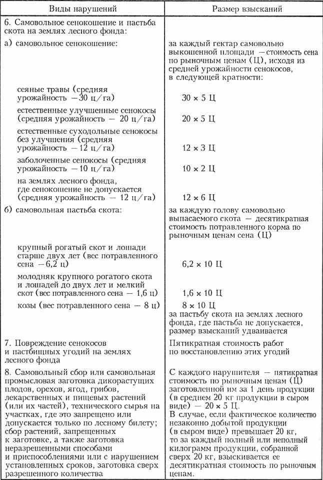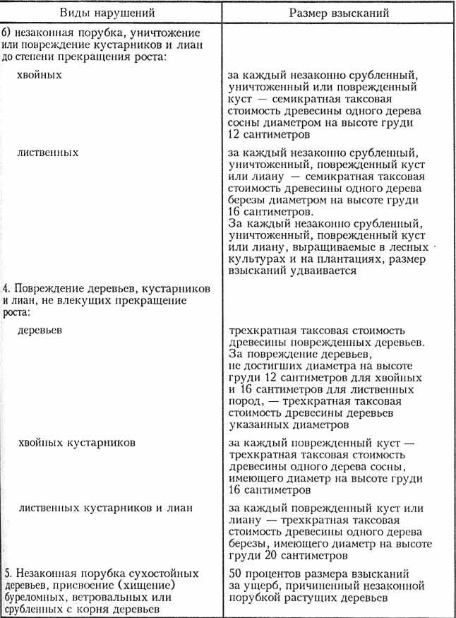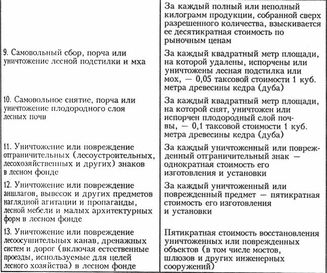 Примечания: 1. Во всех случаях, когда размер взысканий за ущерб, причиненный нарушениями лесного законодательства, исчисляется по таксам на древесину, отпускаемую на корню, таксы применяются без установленных норм снижения стоимости древесины (скидок), а надбавка применяется в максимальном размере, независимо от удаленности квартала (урочища) во всех лесотаксовых поясах. 2. При исчислении таксовой стоимости древесины разделение ее на деловую и дровяную не производится. Для всего объема древесины применяется такса на деловую древесину средней крупности. Объем древесины учитывается (определяется) в коре. В случае определения объема уничтоженных, поврежденных или срубленных деревьев, кустарников и лиан на площади более 1 гектара допускается использование материалов лесоустройства. 3. При исчислении стоимости создания и выращивания лесных культур, плантаций, стоимости восстановительных работ при повреждении сенокосов и пастбищных угодий, уничтожения или повреждения отграничительных знаков, аншлагов, вывесок и других предметов наглядной агитации и пропаганды, лесной мебели и малых архитектурных форм, лесоосушительных канав, дренажных систем и дорог применяются действующие расчетно-технологические и нормативно-технологические карты и другие нормативы затрат. 4. При уничтожении или повреждении деревьев, кустарников, лиан, лесной подстилки, мха, почвы, сенокосов и пастбищных угодий, а также отграничительных (лесоустроительных и лесохозяйственных) знаков, аншлагов, вывесок, других предметов наглядной агитации и пропаганды, лесной мебели, малых архитектурных форм, лесоосушительных канав, дренажных систем, дорог в результате воздействия сточных вод, химических и радиоактивных веществ, промышленных и коммунально-бытовых выбросов, отходов, ввода в эксплуатацию производственных объектов без устройств, предотвращающих вредное воздействие на леса, лесных пожаров, возникших в результате поджога или небрежного обращения с огнем, применяются установленные размеры взысканий за соответствующие виды нарушений. В состав ущерба включаются, кроме того, расходы по приведению территорий в состояние, пригодное для использования в лесном хозяйстве, и все расходы по тушению пожаров. 5. Возмещение ущерба, причиненного уничтожением или повреждением находящихся в лесу зданий, сооружений и другого имущества в результате пожара, возникшего вследствие нарушения лесного законодательства, производится в порядке и размерах, предусмотренных общими нормами гражданского законодательства. 6. Размер взысканий за нарушения лесного законодательства, совершенные в лесах I группы, а также в особо защитных участках лесов всех групп, увеличивается в два раза. 7. Незаконная порубка, уничтожение, повреждение деревьев, кустарников и лиан, запрещенных к рубке правилами отпуска древесины на корню, правилами рубок и другими нормативными документами, влечет увеличение установленных размеров взысканий в два раза. При этом применяются таксы на древесину кедра (дуба) по первому лесотаксовому поясу. 8. Ответственность за уничтожение или повреждение лесных культур, плантаций, сеянцев и саженцев в лесных питомниках лосями, кабанами и другими охотничье-промысловыми животными в случаях превышения действующих нормативов их численности несут юридические лиц