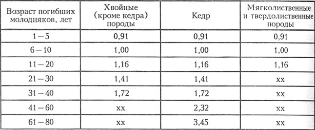 15. Культуры, хвойные молодняки естественного происхождения и хвойный подрост на площадях, пройденных мерами содействия естественному возобновлению, повреждается лесными пожарами до полной гибели на всей площади, пройденной огнем. Лиственные молодняки и лиственный подрост при пожарах слабой, средней и сильной интенсивности повреждаются соответственно на 25, 50 и 100 процентов. 16. Ущерб при повреждении культур, молодняков естественного происхождения и подроста на площадях, пройденных мерами содействия естественному возобновлению (в дальнейшем именуется — молодняков), определяется на базе нормативов затрат на выращивание 1 га молодняков до возраста смыкания крон. Нормативы затрат утверждаются органами государственной власти субъектов Российской Федерации по представлению органов управления лесным хозяйством в соответствующих субъектах Российской Федерации. 17. При расчете ущерба от повреждения молодняков учитывается возраст поврежденных молодняков путем умножения норматива затрат на выращивание 1 га молодняков до возраста смыкания крон на соответствующий коэффициент (приложение 4). Пример 3. Беглым низовым пожаром средней интенсивности пройдено три выдела с молодняками. На первом выделе огнем поврежден подрост сосны естественного происхождения в возрасте 10 лет на площади 4,5 га; на втором — культуры сосны в возрасте 25 лет на площади 3 га, на третьем подрост березы в возрасте 10 лет на площади 2 га. Норматив затрат на выращивание 1 га насаждений до возраста смыкания крон установлен в размере 800 руб/га. На первом и втором выделах хвойные молодняки погибли полностью (на 100%). На третьем выделе подрост березы поврежден на 50% (пункт 14). Поправочные коэффициенты на возраст молодняков к нормативу затрат на выращивание 1 га насаждений (приложение 4) составят: 1,0, 1,41 и 1,0 для первого, второго и третьего выделов соответственно. Ущерб будет равен: