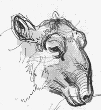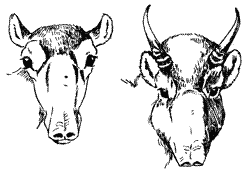 Начало мая в калмыцких степях в этом году выдалось не столь жарким, а временами и просто дождливым. Но это не мешало, а даже способствовало нам в полевых исследованиях: мы проехали на машине и прошли пешком не один десяток километров. Нашему взору представилась безрадостная картина: повсюду мы натыкались на черепа сайгаков с отпиленными под самый корень рогами. Становилось жутко. Одно место повергло нас в шок — в небольшой западине среди невысоких барханов притулился крошечный домик (даже не домик, а нечто похожее на нору) из саманного кирпича, вокруг которого разбросаны десятки изуродованных черепов. Видимо, эта западина использовалась браконьерами как место для осуществления их черного дела. Сайгак (Saiga tatarica) — единственный представитель рода Saiga, один из наиболее обособленных представителей семейства полорогих (Bovidae). Зоологи-систематики до сих пор спорят о том, какое место эти необычные животные занимают среди других копытных. Длительное время сайгака считали антилопой и относили к подсемейству Antilopinae. Другие ученые включают его в подсемейство козлов (Caprinae), а некоторые предлагают выделить в отдельное подсемейство — Saiginae. Размеры тела взрослых самцов составляют 120—140 см, самок — 100—120 см, высота в холке у самцов в среднем 75 см, у самок — 70 см. Вес взрослых самцов колеблется от 30 до 50 кг, самок — от 20 до 40 кг. Внешний вид сайгака настолько оригинален, что его невозможно спутать ни с кем. Пожалуй, самое примечательное в облике этого степного зверя — его “физиономия”. И все из-за носа: мягкий и подвижный, как хобот, он низко нависает над нижней губой и заканчивается большими округлыми ноздрями, разделенными тонкой перемычкой. При нормальном положении головы ноздри направлены вниз. Этот хоботок — на первый взгляд довольно нескладное образование — очень помогает при быстром беге: большие стада в сухой период года движутся в сплошном облаке пыли, а зимой — в своеобразном снежном облаке (красиво!). Хоботок, словно респиратор, очищает вдыхаемый воздух, а когда холодно, прогревает его. Эта сильно вздутая верхняя часть морды — не что иное, как хорошо развитое, как говорят анатомы, преддверие носа, т.е. начало дыхательных путей. Способность раздуваться, развитая сеть кровеносных сосудов и наличие желез, выделяющих слизь на внутренних стенках полости преддверия, обеспечивают очистку, согревание и увлажнение воздуха, поступающего в более глубокие отделы дыхательной системы (бронхи и легкие).