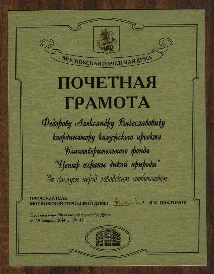 Почетная грамота за заслуги перед городским сообществом была вручена Федорову Александру Вячеславовичу - координатору калужского проекта Благотворительного фонда «Центр охраны дикой природы».