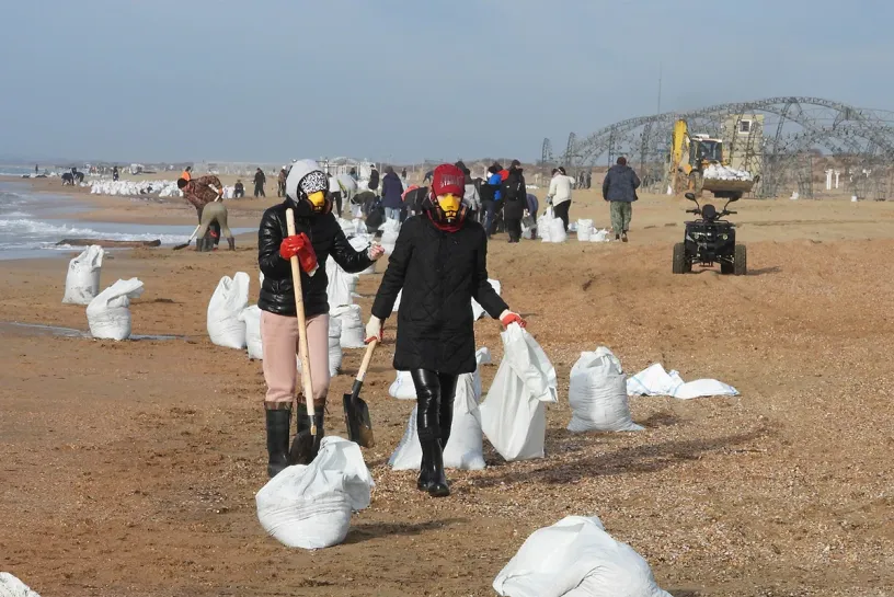 Сотни людей в субботу утром стоят вдоль воды тонкой шеренгой на пляже в Витязево. Мазутной жижи на поверхности песка не видно. Люди кладут лопатами песок с небольшими вкраплениями нефтяного вещества в пластиковые мешки. Зевак здесь нет. Любому, кто оказывается у воды, предлагают взять в волонтерском штабе лопату, мешок, защитный костюм, респиратор и перчатки, иначе одежду, перепачканную мазутом, придется выбросить.